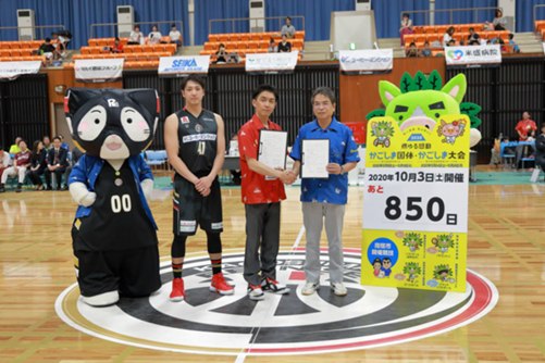 最終日には、鹿児島レブナイズ対大塚商会アルファーズ戦の試合開始前に指宿市と鹿児島レブナイズの「地域活性化に関する連携協定」の協定・調印式が行われ、豊留市長と鹿児島レブナイズの小牧正英社長が協定書にサインを交わしました。