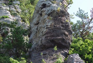 魚見岳の8合目にある,注連縄が巻かれた,通称「天狗岩」。魚見岳には天狗が住むという伝説があり,この天狗は赤い色のものが大嫌いなため,山には赤色の花が咲かないという。また,赤い色の着物を着て山に登ろうものなら,天狗に蹴落とされてしまうとの言い伝えも残っている。