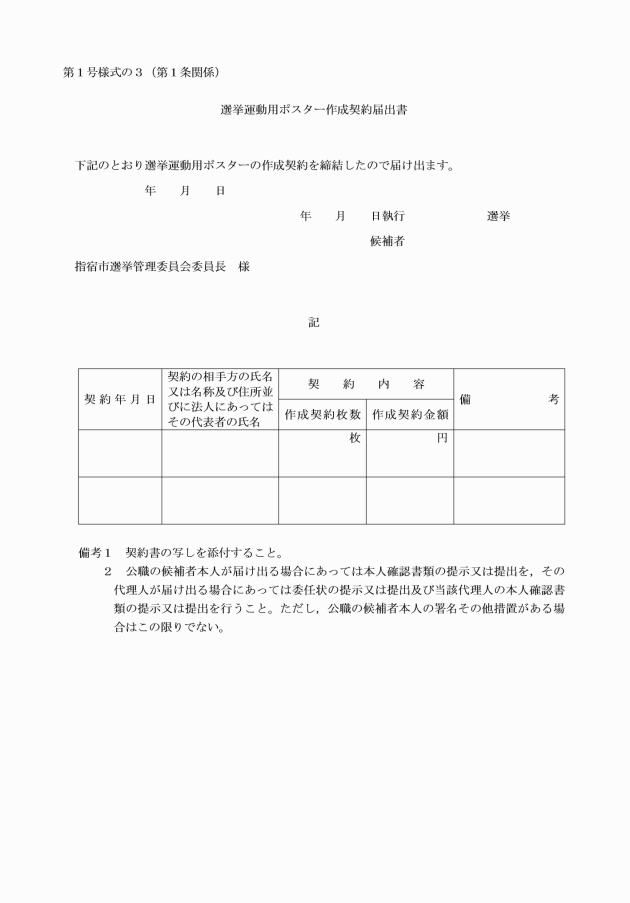 第4条 候補者は,選挙運動用自動車使用証明書,選挙運動用ビラ作成証明書又は選挙運動用ポスター作成証明書を,使用又は作成の実績に基づき作成し,条例第3条に規定する有償契約を締結した一般乗用自動車運送事業を経営する者その他の者又はポスター作成業者(以下「契約業者等」という。)に提出しなければならない。