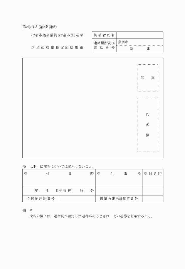 第3条 掲載文は,委員会が交付する選挙公報掲載文原稿用紙(第2号様式)に,黒色の色素により記載し,かつ,色の濃淡がないものとしなければならない。