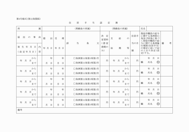 4 扶養親族のある職員が任命権者を異にして,異動した場合は異動前の任命権者は,その職員の扶養手当認定簿を異動後の任命権者に送付し,扶養親族届及びこれに関する証拠書類を保管するものとする。