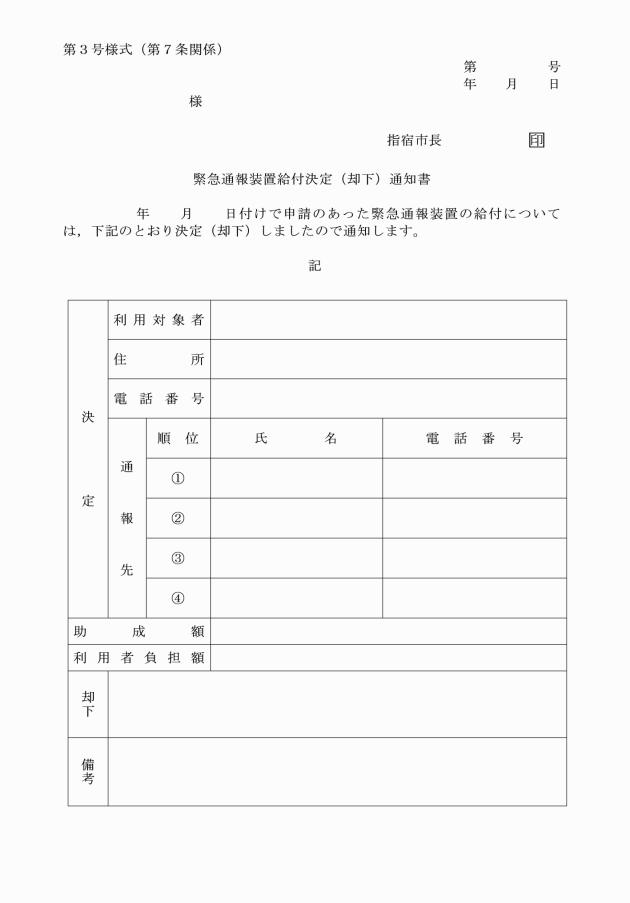 第10条 第1通報先を親族以外の者(消防署を除く。)又は市外に居住している親族に設定している通報装置利用者のうち,その第1通報先を市内に居住している親族又は消防署に設定を変更しようとする者(以下「変更申請者」という。)は,事前に緊急通報装置通報先変更費用助成申請書(第5号様式)を提出するものとする。
