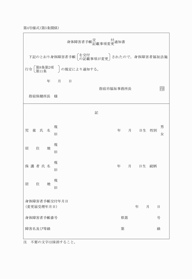 第5条 施行令第8条第2項及び第11条の規定による保健所長への通知は,身体障害者手帳交付・記載事項変更通知書(第4号様式)によるものとする。