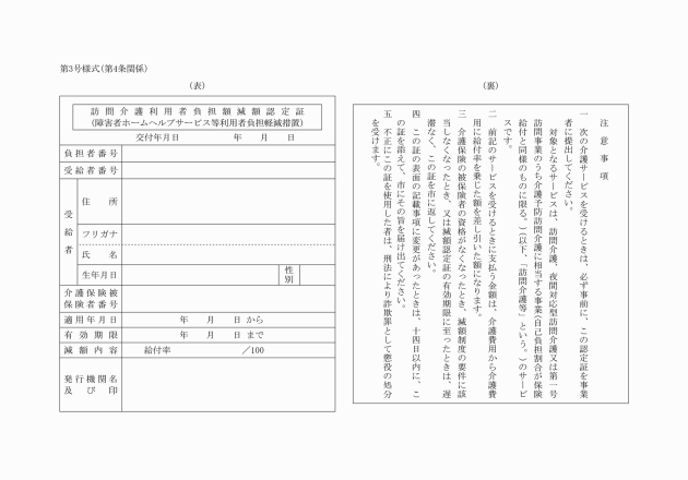 第5条 減額を受けようとする者は,訪問介護の利用開始に当たり,事前に認定証を事業者に提示するものとし,事業者は認定証に記載されている減額内容に基づく減額を行うものとする。