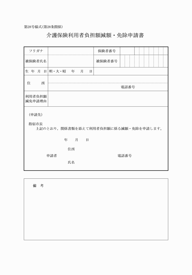 2 法第50条又は第60条の規定により利用者負担の減免・免除認定を受けようとする者は,介護保険利用者負担額減額・免除申請書(第28号様式)を市長に提出しなければならない。