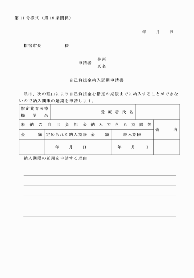 第18条 市長は,納入義務者がやむを得ない理由により,自己負担金を指定する期日までに納入することが著しく困難であると認めるときは,1年の範囲内で当該自己負担金の納入期限を延期することができる。