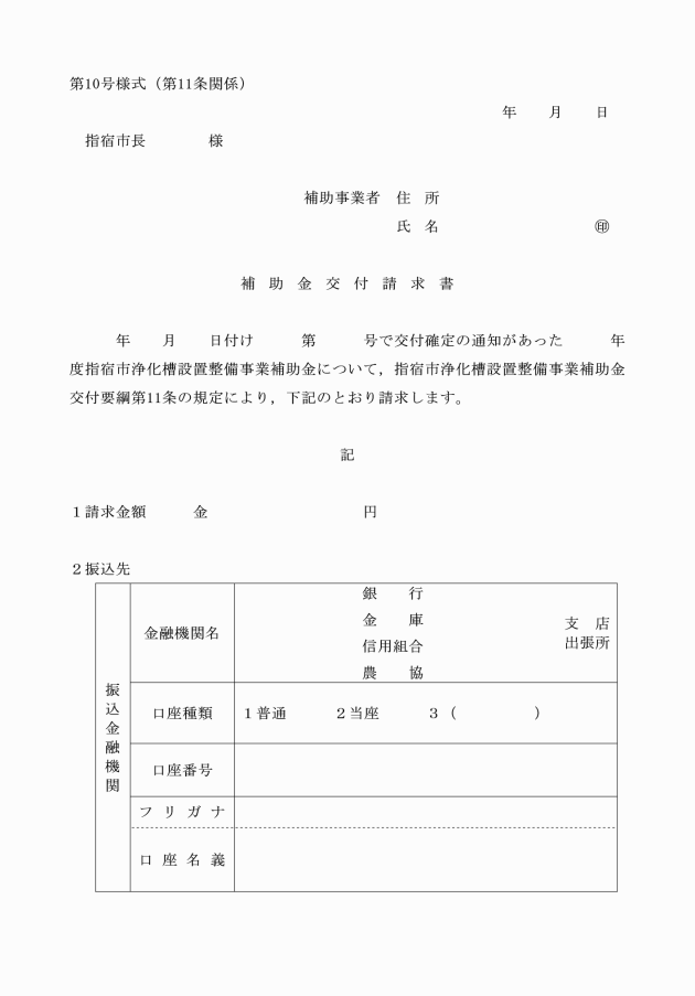 第3条 市長は,下水道法(昭和33年法律第79号)第4条第1項により定めた区域外において,処理対象人員10人槽以下の浄化槽又は市の指定する区域に処理対象人員10人槽以下の高度処理型浄化槽(以下「浄化槽等」という。)を住宅に設置しようとする者に対して,予算の範囲内で補助金を交付する。