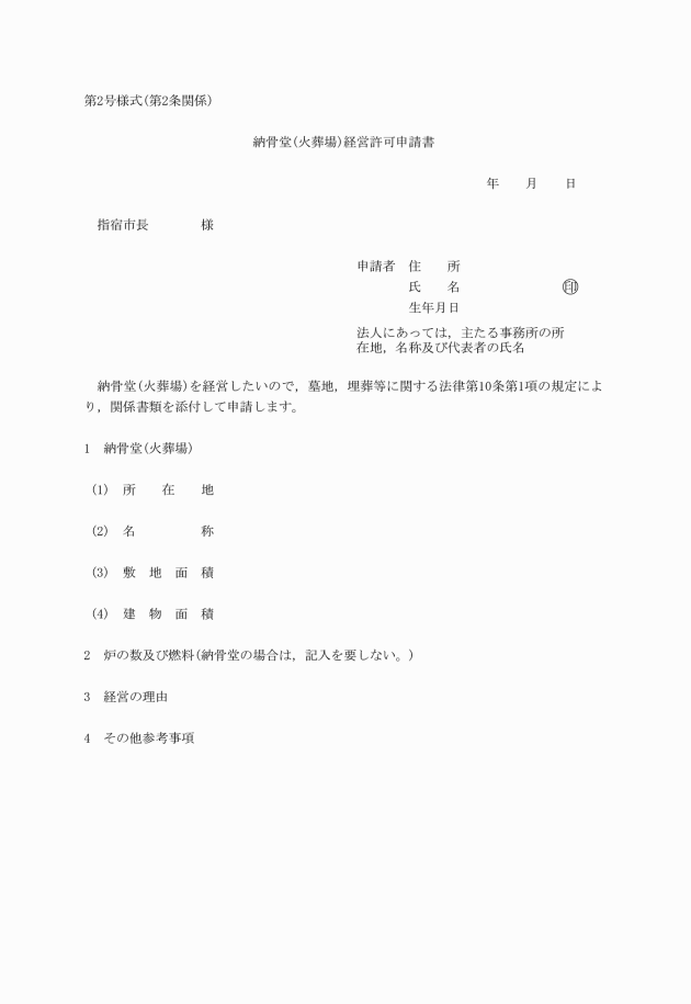 3 法第10条第2項の規定により墓地,納骨堂又は火葬場の経営の廃止の許可を受けようとする者は,墓地(納骨堂,火葬場)経営廃止許可申請書(第4号様式)に,墓地及び納骨堂にあっては改葬計画書を添付して,これを市長に提出しなければならない。