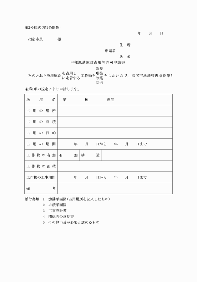 4 占用者等が許可事項(期間に係る事項を除く。)の変更の許可を受けようとする場合は,甲種漁港施設占用等変更許可申請書(第4号様式)を市長に提出しなければならない。