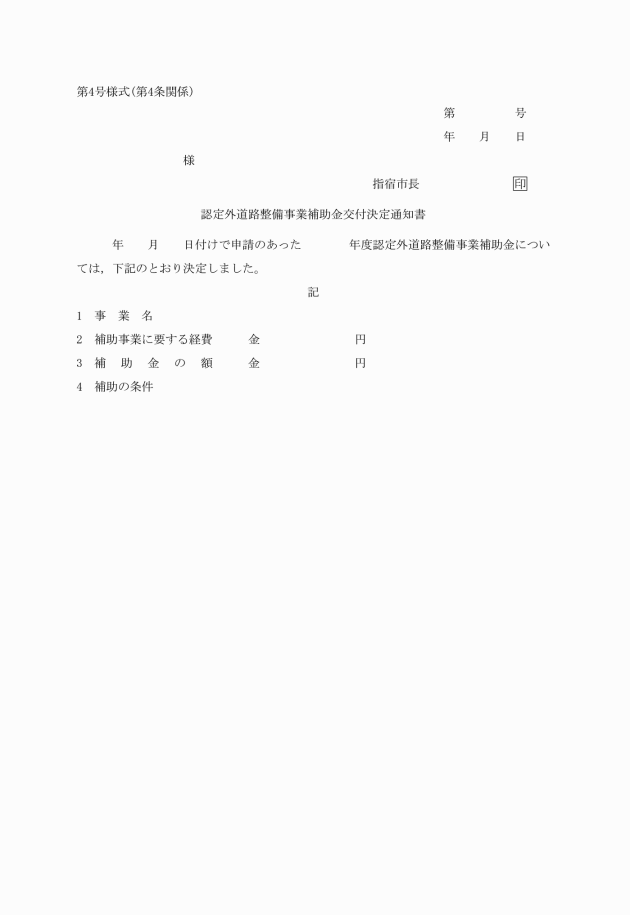 第8条 補助金の交付申請人が,やむを得ない事情により補助金の交付決定前に事業着手する必要がある場合には,認定外道路整備事業事前着手承認申請書(第8号様式)を市長に提出し,その承認を受けなければならない。