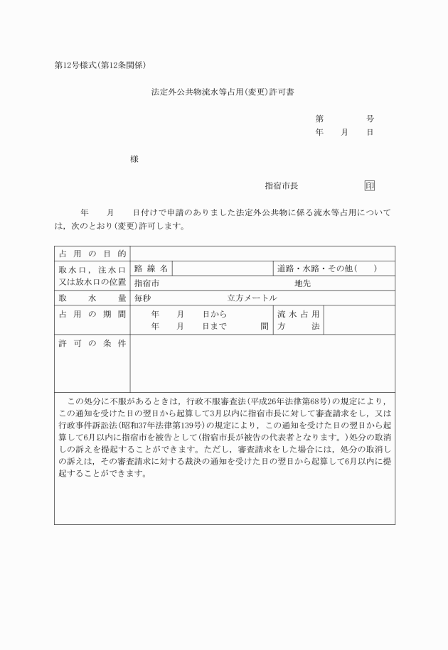 (3) 条例第4条第1項第4号に掲げる行為に係る許可(変更許可を含む。) | 法定外公共物流水等占用(変更)許可書(第12号様式) |