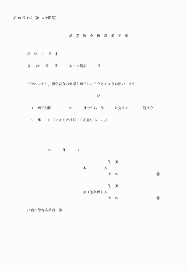 第13条 奨学生であった者が奨学資金の償還猶予を申請するときは,その理由を証明する書類を添えて奨学資金償還猶予願(第19号様式)を教育委員会に提出しなければならない。