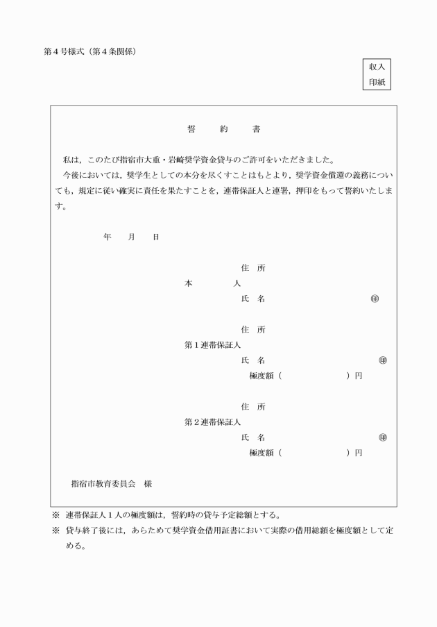 第4条 奨学生は,誓約書(第4号様式)及び在学証明書を,教育委員会が指定する日までに提出しなければならない。