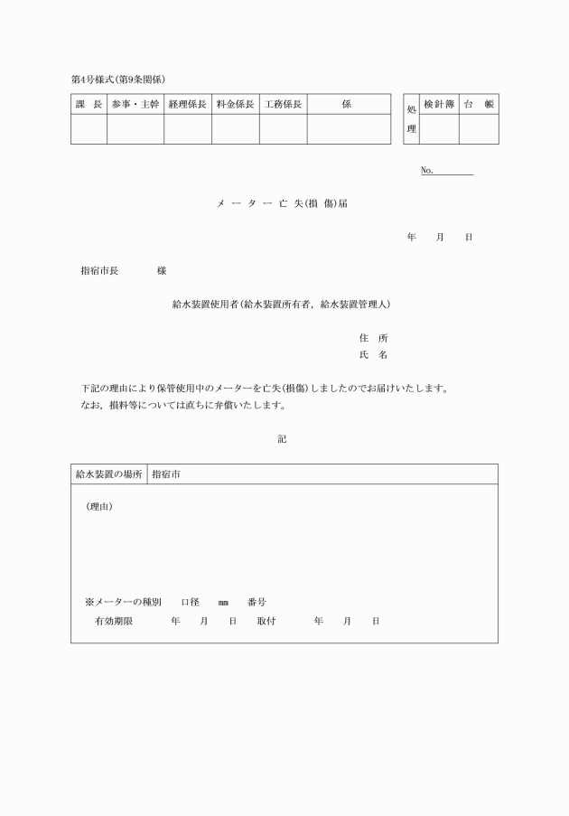 第9条 水道の使用者又は管理人若しくは給水装置の所有者は,自己の保管に係るメーターを亡失又は損傷したときは,メーター亡失(損傷)届(第4号様式)を市長に届け出なければならない。