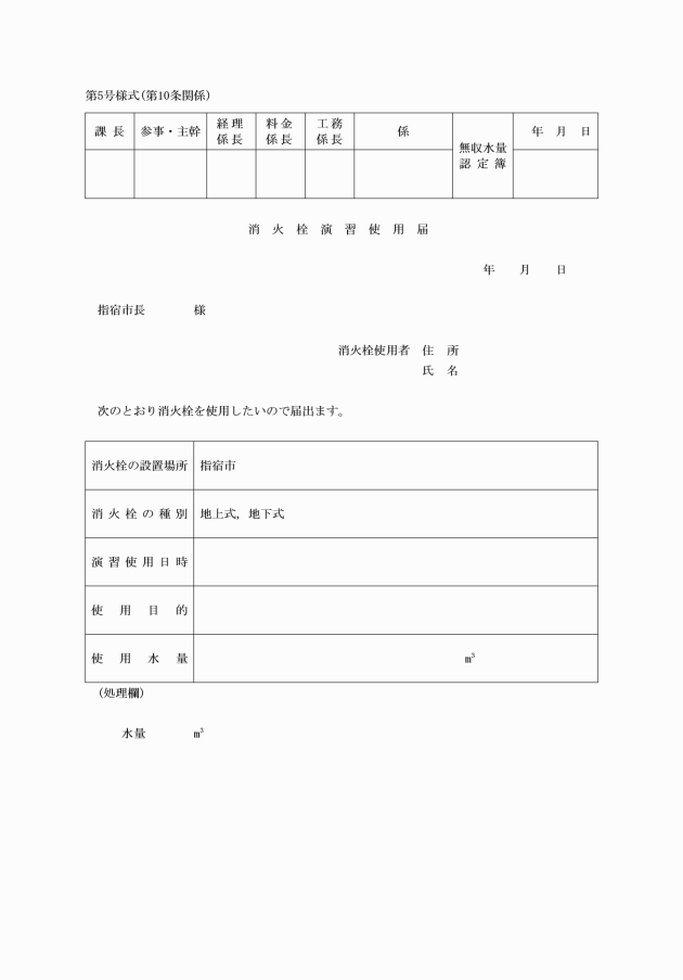 (2) 消火演習に消火栓を使用するときは,消火栓演習使用届(第5号様式)の提出をもって行う。