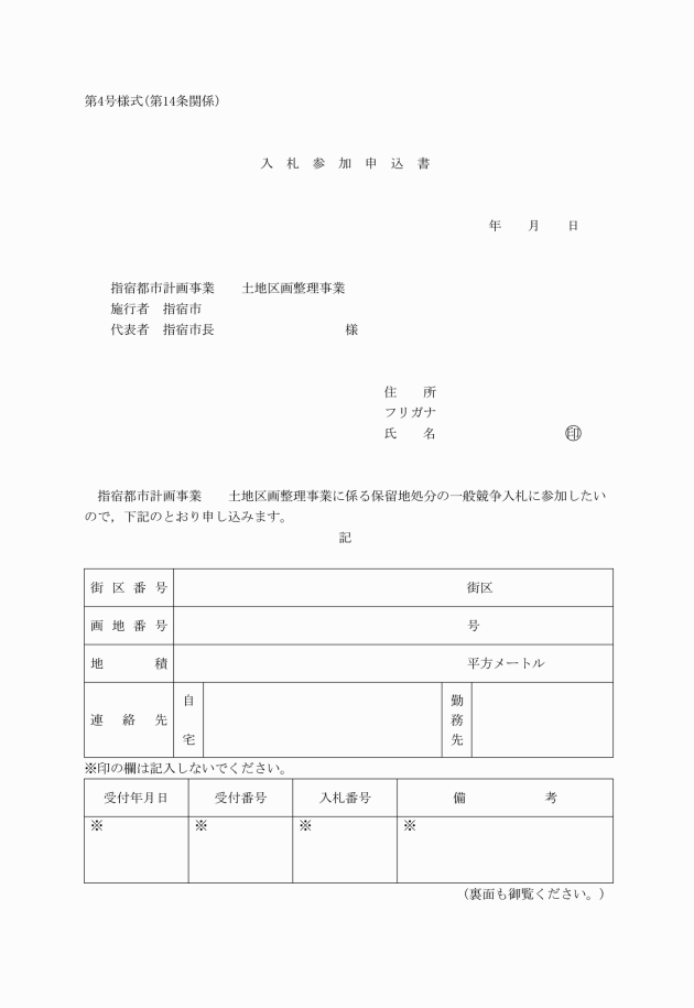 第14条 一般競争入札に参加しようとする者は,受付期間内に入札参加申込書(第4号様式)を市長に提出しなければならない。