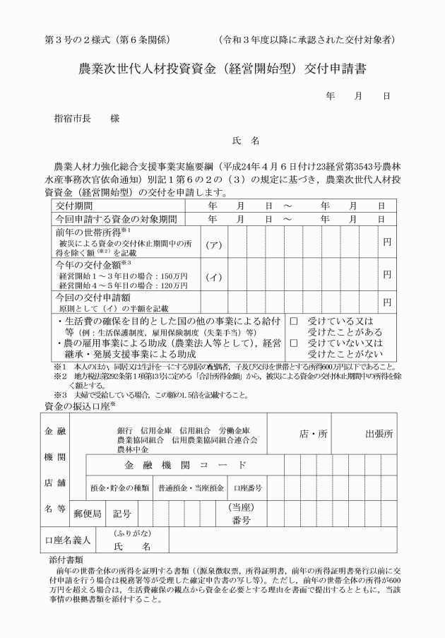 第3条 資金の交付を受けようとする者(以下「申請者」という。)は,青年等就農計画等(農業経営基盤強化促進法(昭和55年法律第65号)第14条の4第1項に規定する青年等就農計画に農業次世代人材投資資金申請追加資料(第1号様式)を添付したもの)を市長に提出し,承認を受けなければならない。計画変更する場合も同様とする。ただし,軽微な変更の場合はこの限りでない。