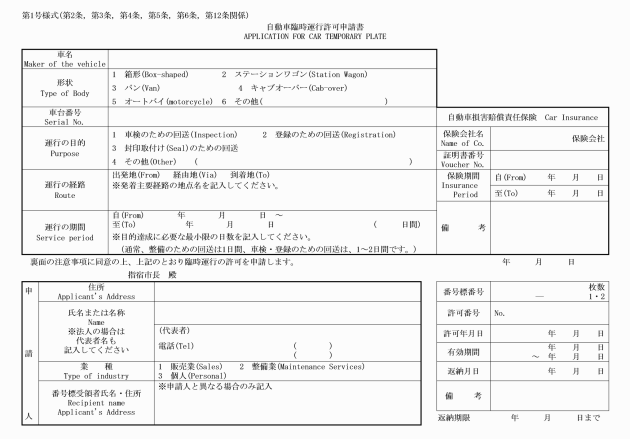 第2条 臨時運行の許可を受けようとする者(以下「申請者」という。)は,許可の申請を自動車臨時運行許可申請書(第1号様式。以下「申請書」という。)により市長に対して行わなければならない。