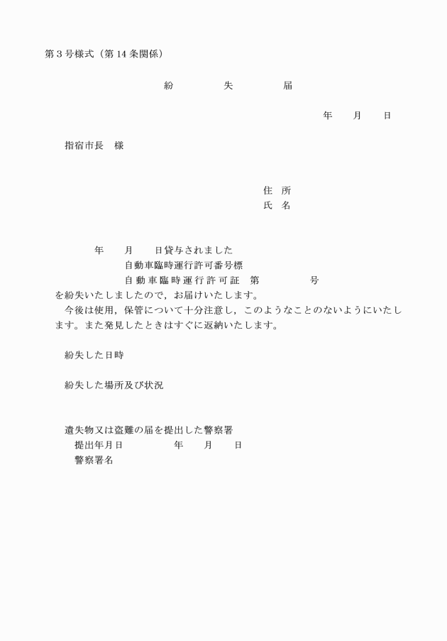 第14条 臨時運行の許可を受けた者が,許可証及び番号標を紛失し,又は破損したときは,直ちに紛失した地域を管轄する警察署長に対して遺失物又は盗難の届出を行うとともに,市長に対して紛失届(第3号様式)により届け出なければならない。