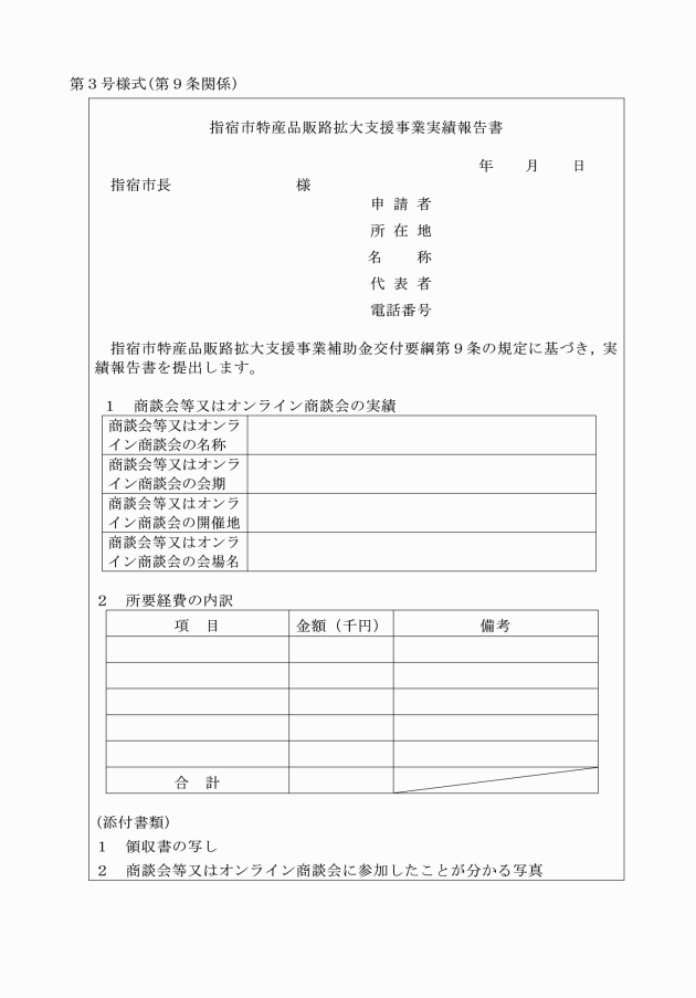 第9条 補助金の交付を受けようとする者は,補助対象事業完了後速やかに,指宿市特産品販路拡大支援事業実績報告書(第3号様式。以下「実績報告書」という。)に次に掲げる書類を添えて市長に提出しなければならない。