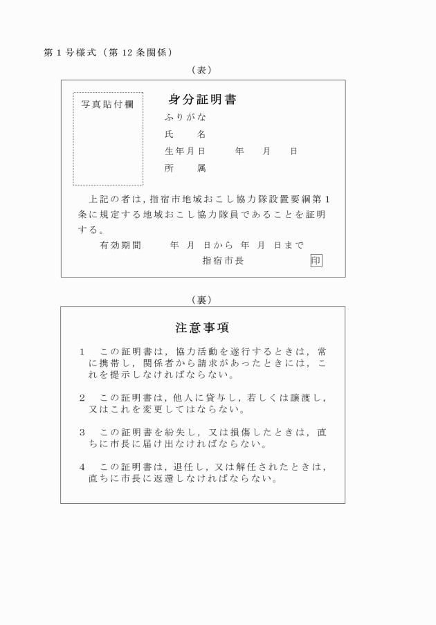 第12条 協力隊員は,協力活動に従事するときは,必要に応じて身分証明書(第1号様式)の交付を受けることができる。