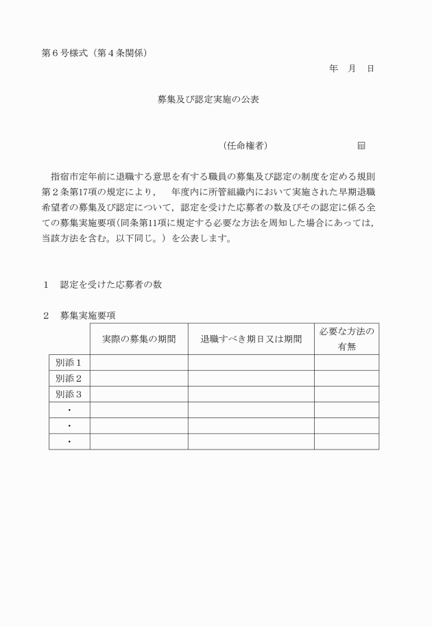 第1条 指宿市定年前に退職する意思を有する職員の募集及び認定の制度を定める規則(平成27年指宿市規則第22号。以下「規則」という。)第2条第9項の規定による応募(以下「応募」という。)は,早期退職希望者の募集に係る応募申請書(第1号様式)によるものとする。