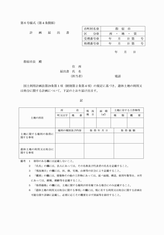 第4条 法第29条第1項及び国土利用計画法施行規則(昭和49年総理府令第72号)第23条に規定する遊休土地の利用又は処分に関する計画の届出(第6号様式。以下「計画の届出」という。)を受理したときは,その日からおおむね6週間以内に当該計画の審査を行うものとする。