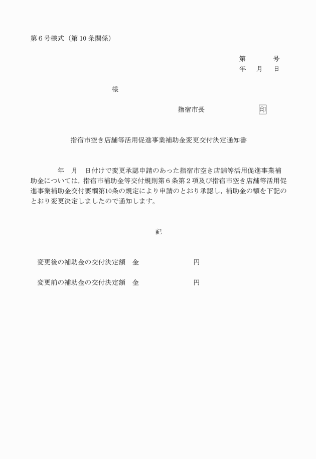 第9条 申請者は,申請書に記載された事項を変更しようとするときは,あらかじめ指宿市空き店舗等活用促進事業補助金変更(中止)承認申請書(第5号様式)に変更内容が確認できる書類を添えて,市長に申請しなければならない。ただし,軽微な変更で市長が認めるものについては,この限りでない。