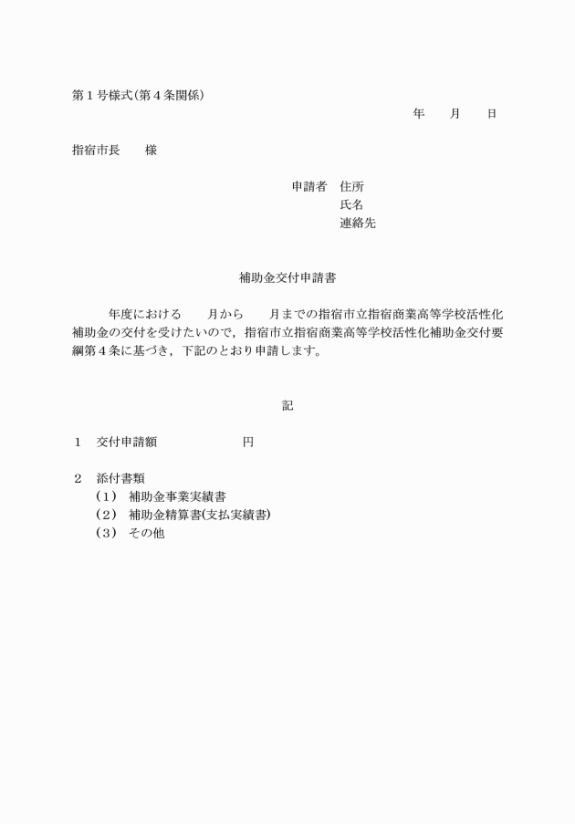 第4条 補助金の交付申請は,次に掲げる書類を添えて当該年度の10月及び3月に申請するものとする。ただし,指商の授業料及び諸会費等に納期到来分の未納があるときは申請できないものとする。