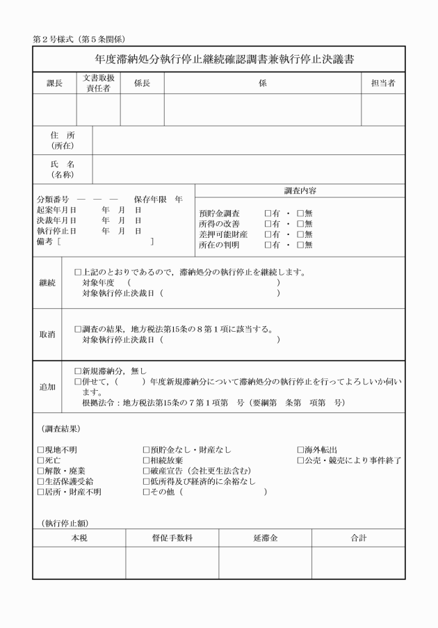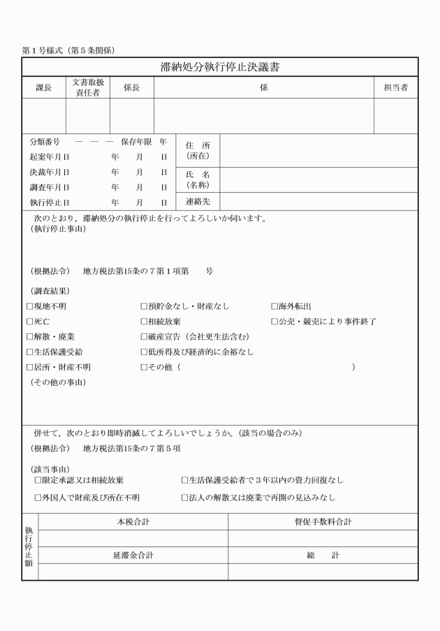 第5条 市長が,執行停止を決定するときは,滞納処分執行停止決議書(第1号様式)により行うものとする。