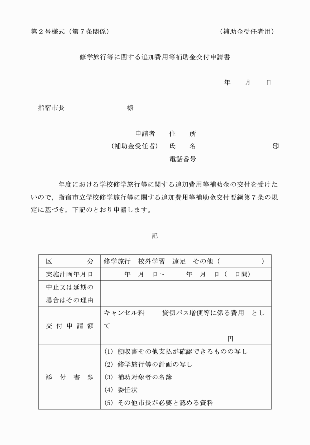 第7条 補助金受任者は,修学旅行等に関する追加費用等補助金交付申請書(第2号様式。以下「交付申請書」という。)に必要な書類を添えて市長に提出しなければならない。