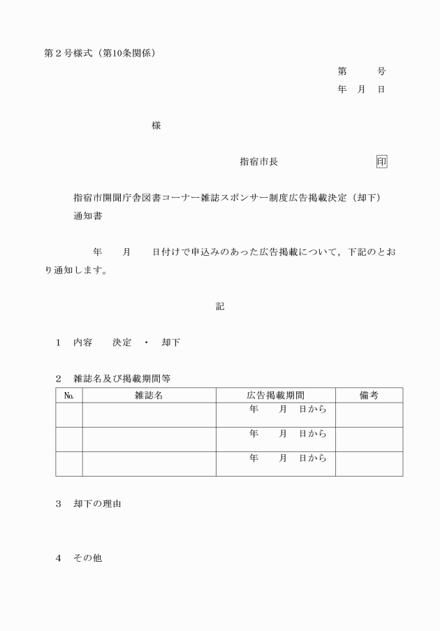 3 市長は,広告内容の変更の可否を決定したときは,指宿市開聞庁舎図書コーナー雑誌スポンサー制度広告内容変更決定(却下)通知書(第4号様式)により,当該広告主に通知するものとする。