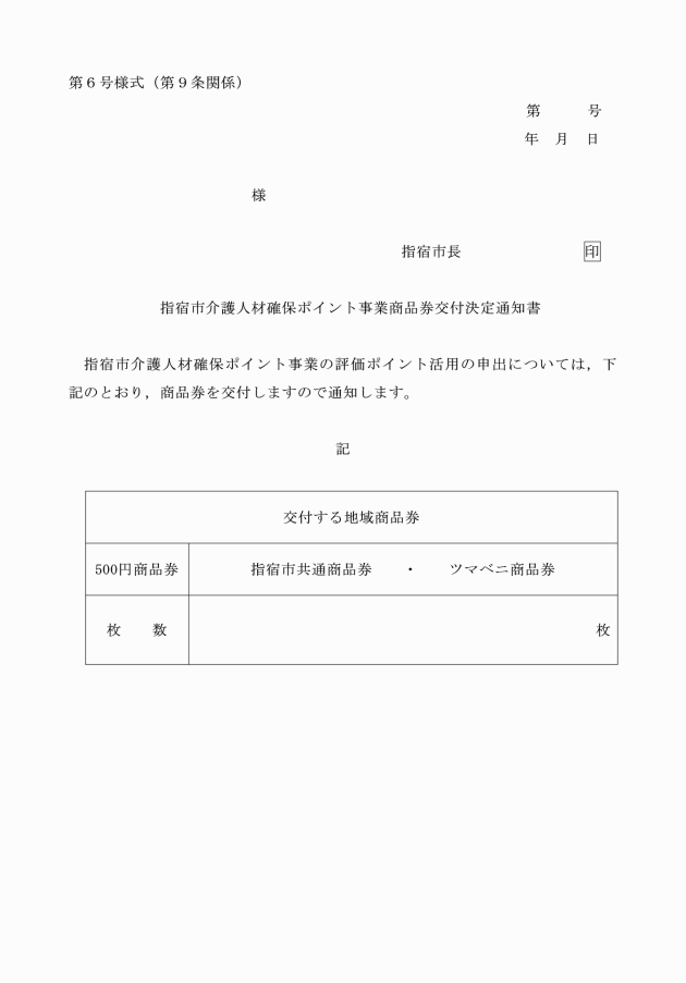 第9条 累積したポイントを地域商品券に交換しようとする者は,指宿市介護人材確保ポイント事業ポイント交換申請書(第5号様式)に必要事項を記入し,ポイント手帳等を添えて,市長に申請しなければならない。