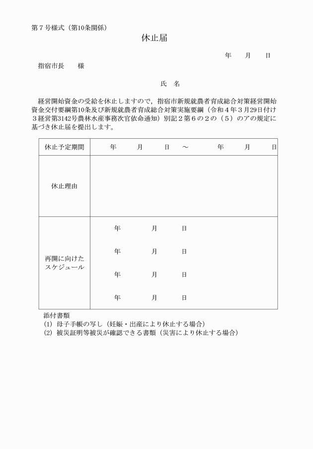 第10条 受給者が,実施要綱別記2の第6の2の(5)アに規定する休止をしようとする場合は,休止届(第7号様式)を市長に提出しなければならない。