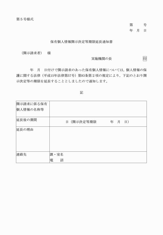 5 | 保有個人情報開示決定等期限延長通知書(第5号様式) | 法第83条第2項 |