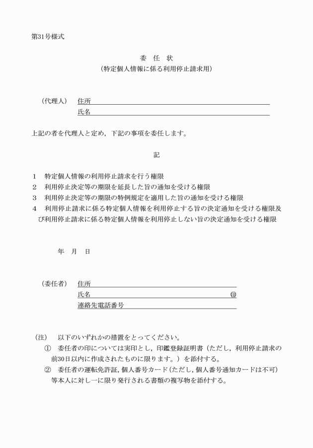 31 | 委任状(特定個人情報に係る利用停止請求用)(第31号様式) | 令第29条において準用する令第22条第3項 |